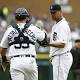 Detroit Tigers catcher Jarrod Saltalamacchia (39) talks with pitcher Mike Pelfrey (37) after Pelfrey allowed his second-straight home run in the first inning of their MLB game against the Texas Rangers at Comerica Park in Detroit, Saturday, May 7, 2016.