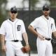 Detroit Tigers pitchers Justin Verlander (35) and Jordan Zimmermann (27) look on during their first full squad spring training workout for the 2016 season at Joker Merchant Stadium training facility in Lakeland, Tuesday, February 23, 2016. (Mike ...