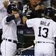 Sep 21, 2015; Detroit, MI, USA; Detroit Tigers catcher Alex Avila (13) receives congratulations from Andrew Romine (27) after he hits a home run in the third inning against the Chicago White Sox at Comerica Park. Mandatory Credit: Rick Osentoski-USA ...